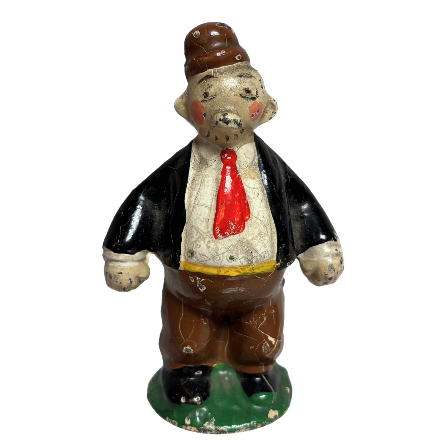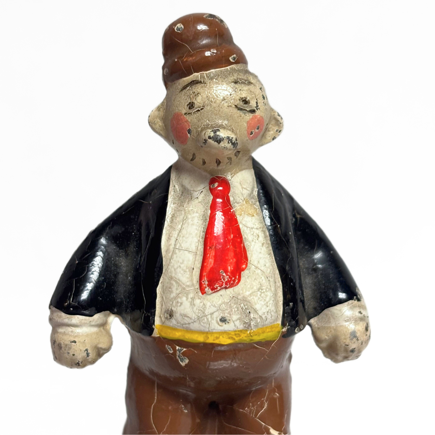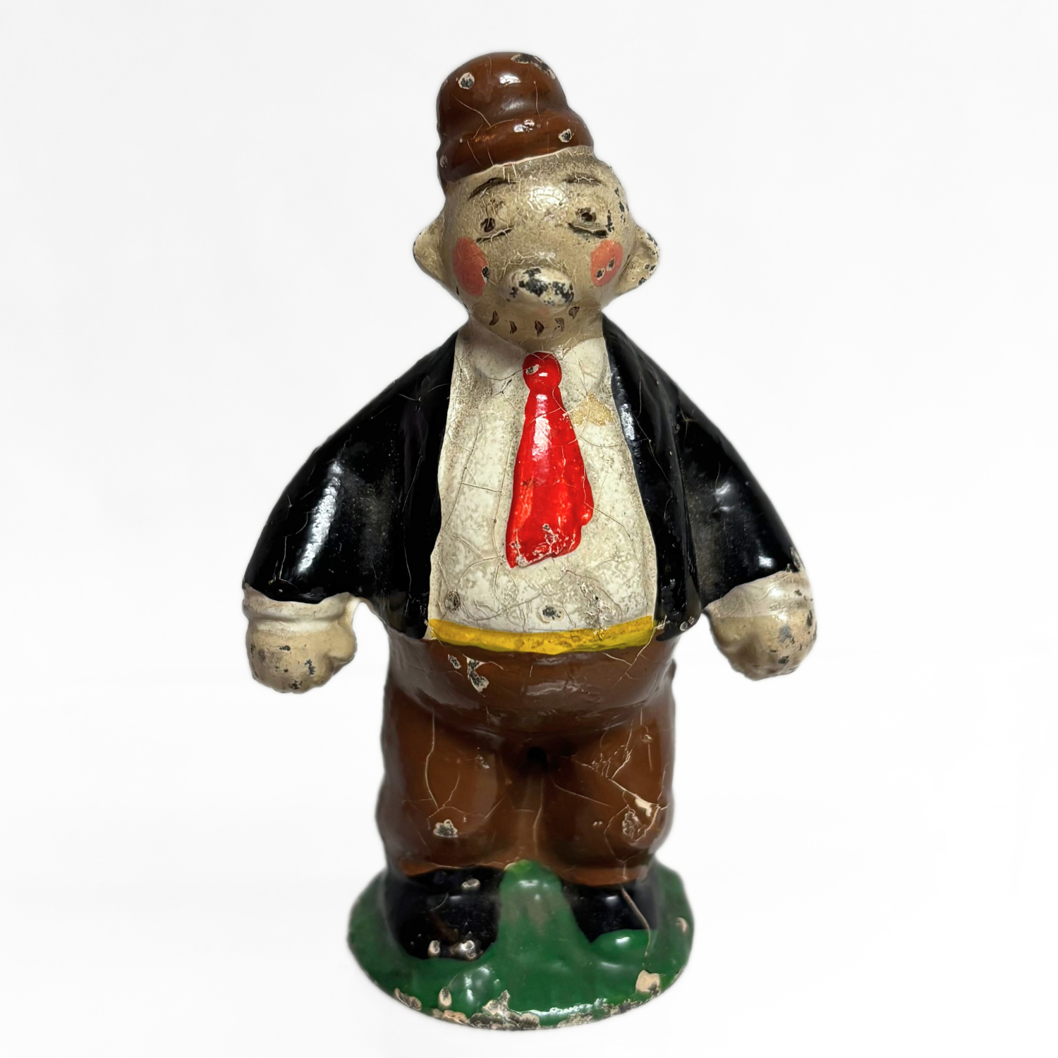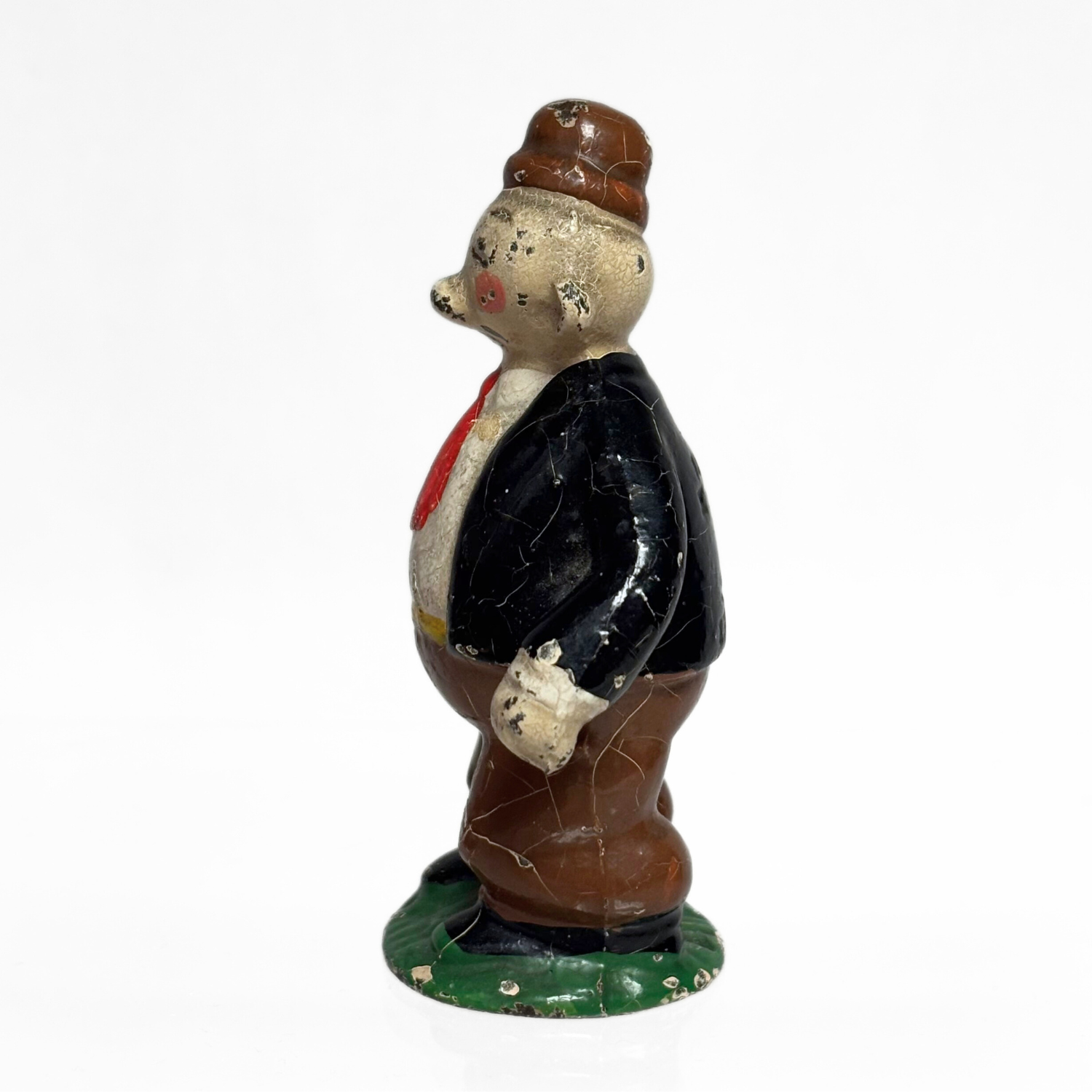 It stands at roughly 3” tall and weighs about 8.2 oz. Due to its age and hand-painted nature, there are visible chips and cracked paint on the figure. However, it is still in good condition especially when taking into account its rarity (and the fact that it is almost a century old!)